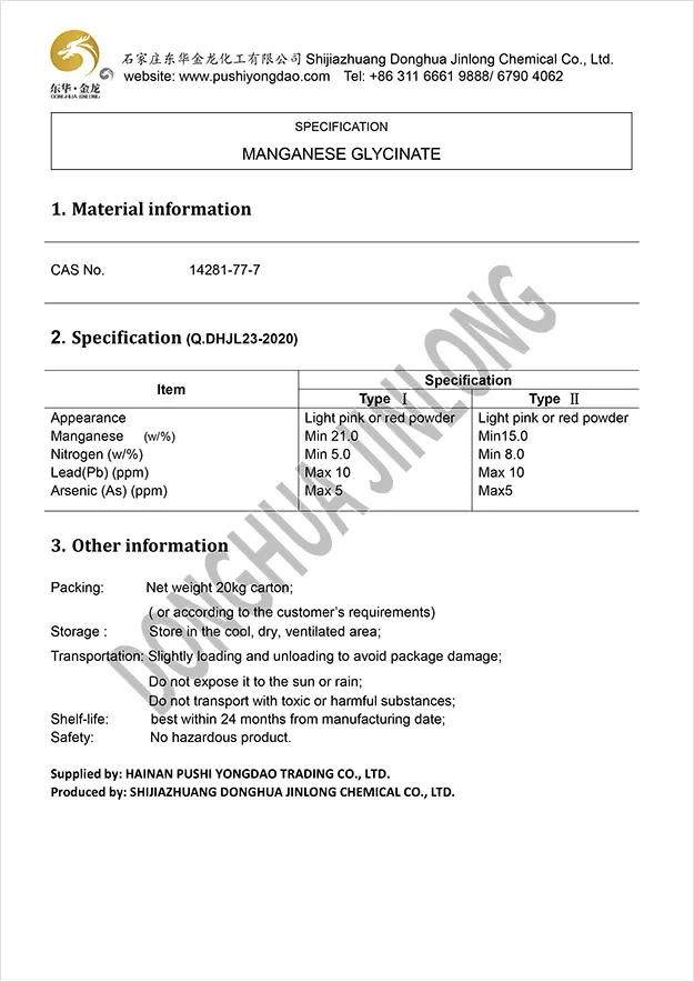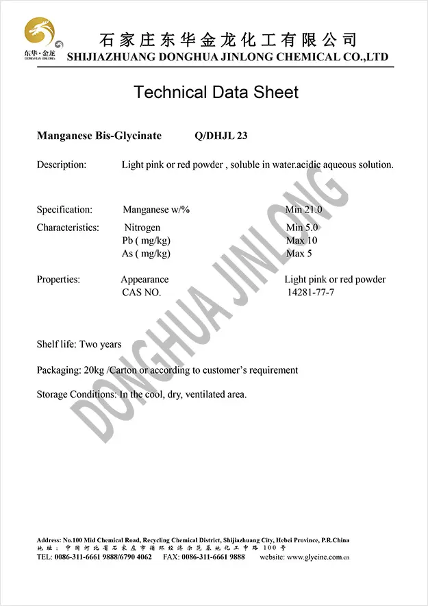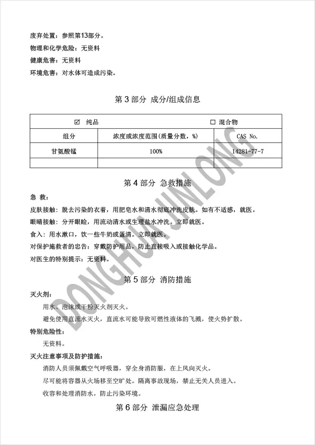 锰主要存在于垂体、肝胰脏和骨的粒线体中,为多种酶的组成部分。锰参与体内的造血过程,促进细胞内脂肪的氧化作用,可防止动脉粥样硬化。锰缺乏时可引起生长迟缓、骨质疏松和运动失常等。甘氨酸锰是一种新型营养强化剂,可用于食品、医药、保健品等行业,起到补充人体所需锰的作用。甘氨酸锰在消化道中大大降低了元素间(如Ca、Mg、Cu、Fe、Zn、Mn等二价离子)的拮抗作用。生物利用度高。