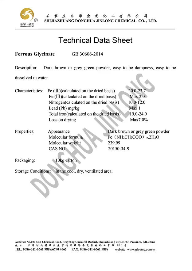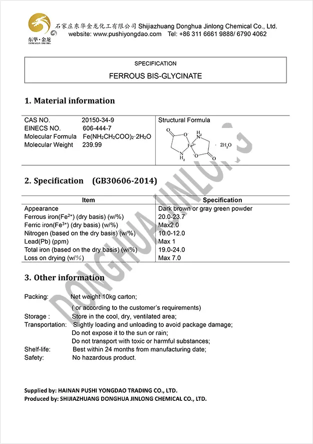 新型营养性补铁剂,是由亚铁与甘氨酸形成的具有环状结构的螯合物。有很高的生物利用度而且稳定性好。甘氨酸亚铁不以游离的Fe2+存在,不会引起胃肠道刺激。甘氨酸亚铁适口性好,没有铁腥味,添加到食品中不影响产品质量。甘氨酸亚铁在消化道中大大降低了元素间(如Ca、Mg、Cu、Fe、Zn、Mn等二价离子)的拮抗作用。