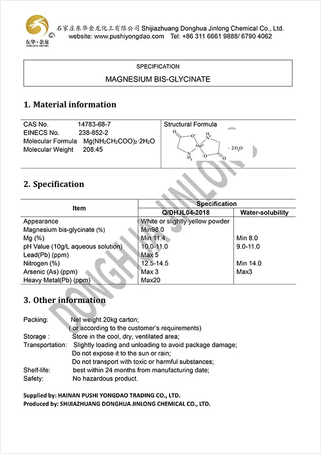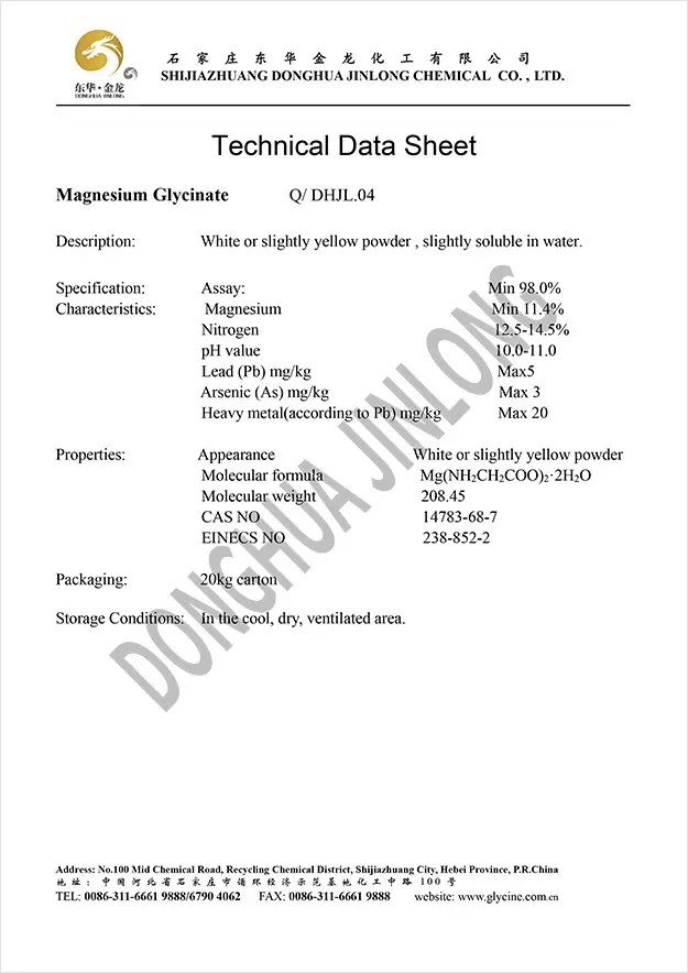 - 新型营养性补镁剂,是由镁元素与甘氨酸形成的具有环状结构的螯合物,吸收效果远高于镁的无机盐、有机盐类。可用于食品、医药、饲料、保健品等行业;