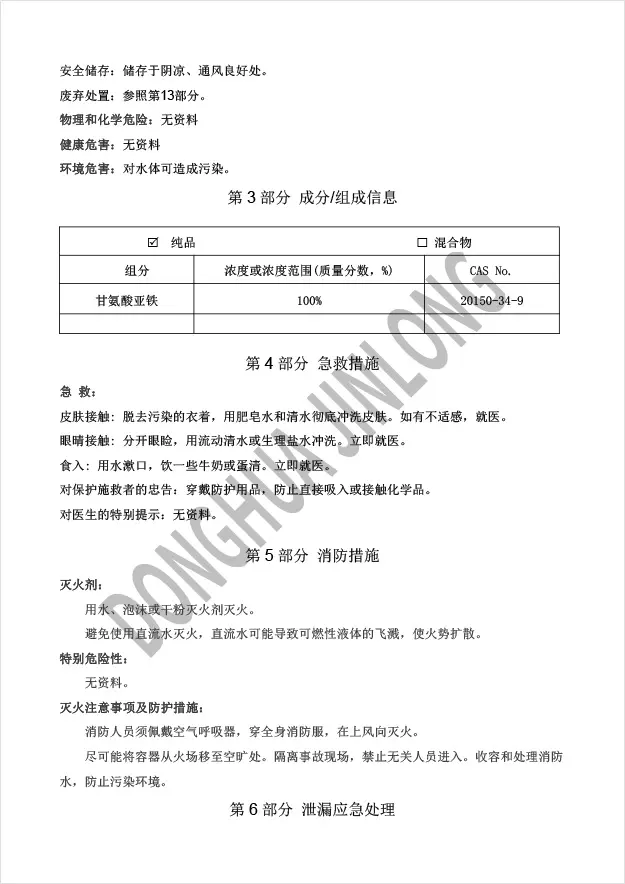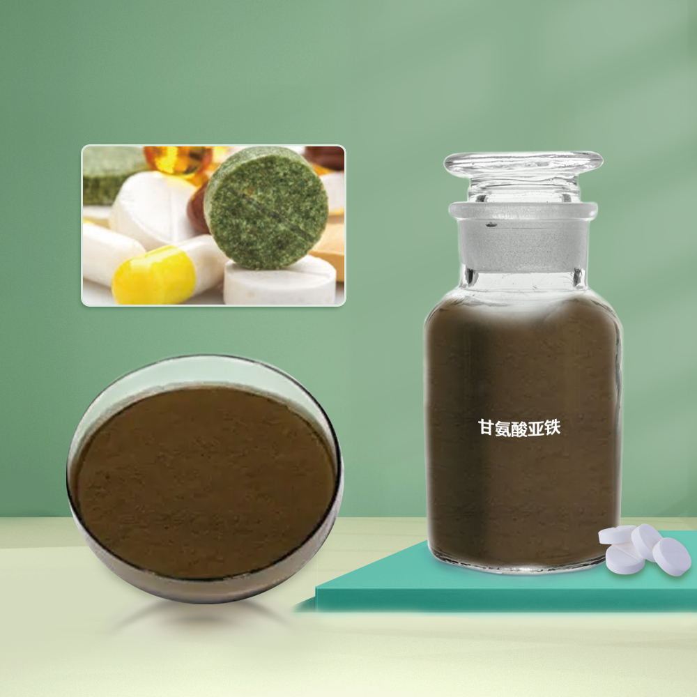 新型营养性补铁剂,是由亚铁与甘氨酸形成的具有环状结构的螯合物。有很高的生物利用度而且稳定性好。甘氨酸亚铁不以游离的Fe2+存在,不会引起胃肠道刺激。甘氨酸亚铁适口性好,没有铁腥味,添加到食品中不影响产品质量。甘氨酸亚铁在消化道中大大降低了元素间(如Ca、Mg、Cu、Fe、Zn、Mn等二价离子)的拮抗作用。